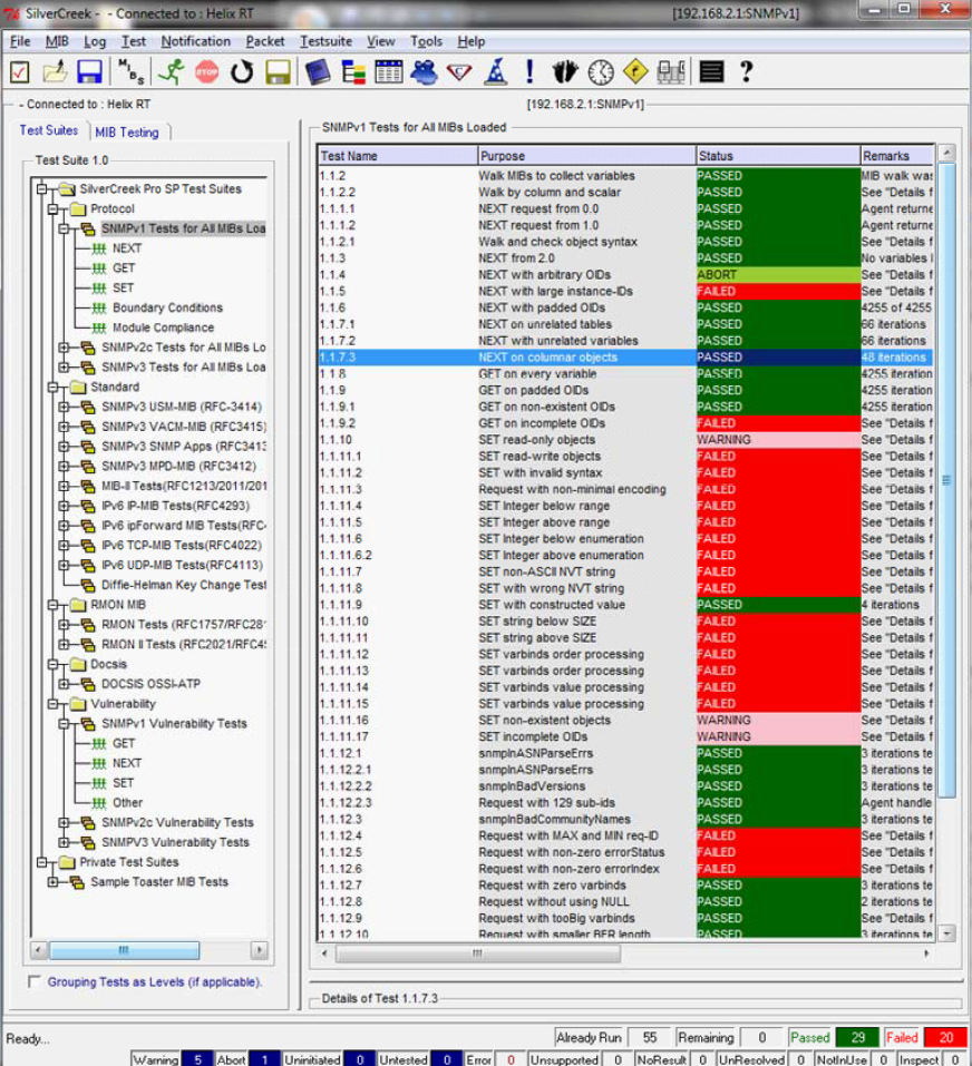 Unlike other tools, SilverCreek automatically loaded a full suite of standard MIBs. This saved me lots of time and hassle. After configuring the SNMP agent IP address and clicking ‘Run’, SilverCreek commenced running its battery of tests. Almost immediately, SilverCreek reported an error: